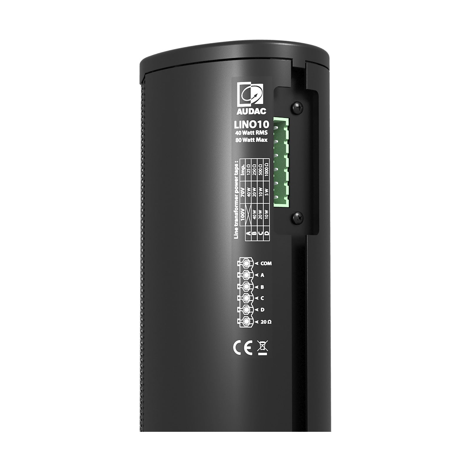 LINO10 består av 4 st 2” låg/mid element och en 1” centralt positionerad diskant för de höga frekvenserna. Den klarar en effekt på 40 Watt (20W RMS), och har 5W, 10W och 20W effekt-val för 100V.