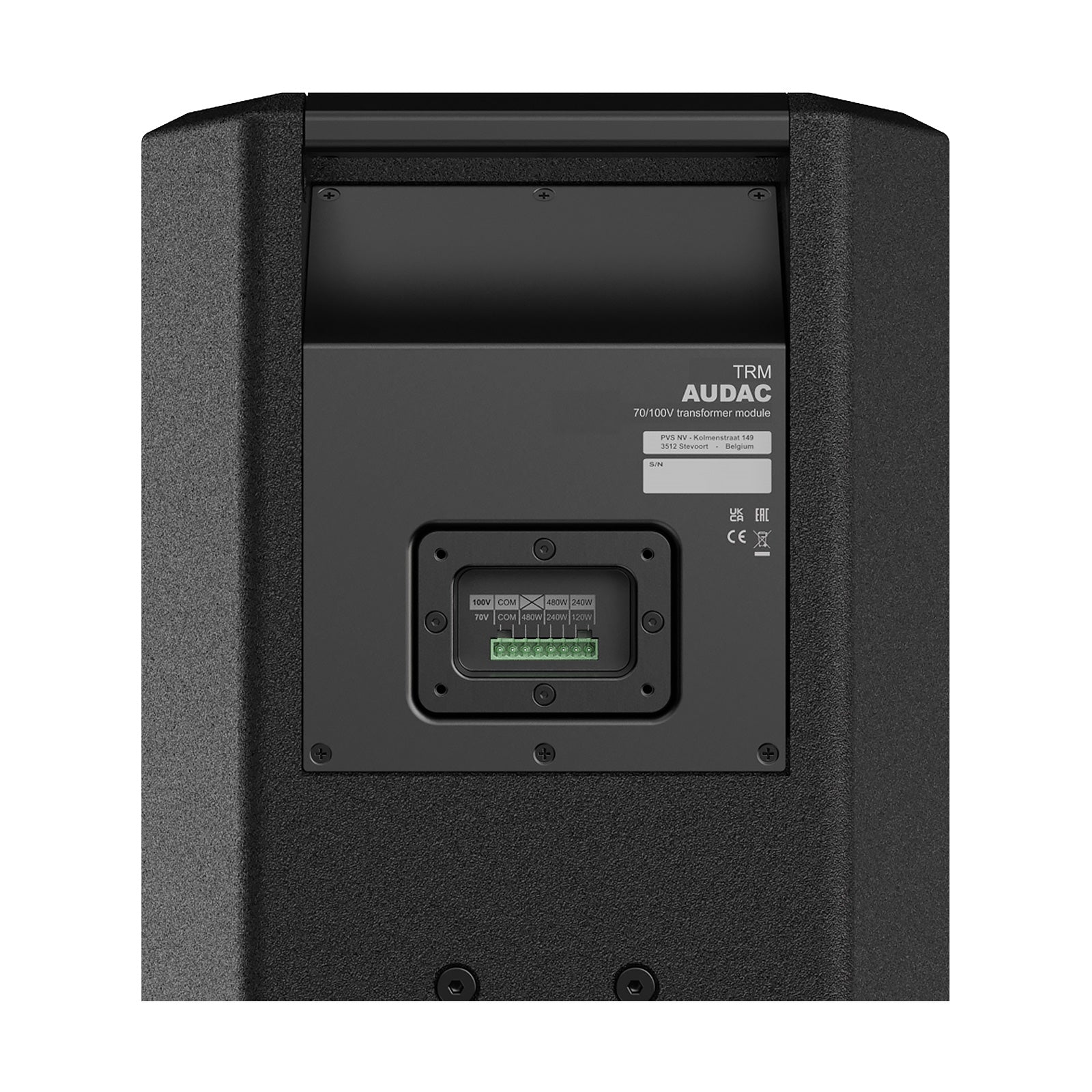 Audac TRM248/B är en 100V modul för att kunna integrera Audacs 12 tum- eller 15 tum PA-högtalare (VEXO112/B, VEXO115/B) i ett högeffekts 100V-system.